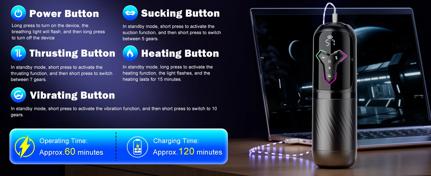 TIPS:Before using the heating function, please try to turn on the Thrusting function so that the head of the machine is magnetically connected to the inner silicone sleeve to trigger the heating function 100%. Please wait 10-15 minutes after turning on the heating function to fully heat up the machine.